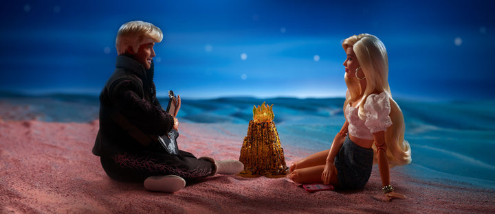 You just might feel good, reserving this made-to-order set by August 23 that recreates an iconic scene from the movie Barbie™. It features posable Barbie and Ken dolls wearing the fashions you saw on screen, and accessories inspired by the scene. Ken doll plays his guitar and sings at Barbie doll by the “campfire.” Barbie doll sits nearby, scrolling her phone, having listened to the same song for four hours straight.