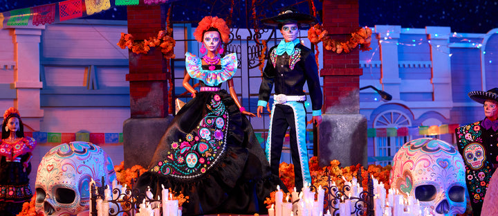 Ken doll looks striking in a black satiny suit with turquoise accents and embroidered details. He completes his look with calavera face paint, a silver belt, and a wide-brimmed sombrero. While sold separately, both Barbie and Ken dolls wear complimentary patterns, making them a perfect set and the ultimate keepsake that inspires joy and elegance.