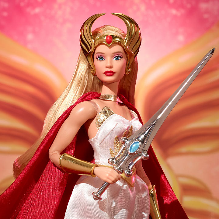 - Armed for action, She-Ra comes with a shield and sword and a shoulder armor attached to a removable soft goods cape. An extra set of hands provides display possibilities.
