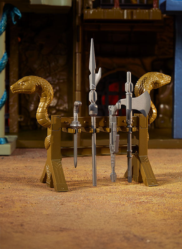 Danger awaits at every turn inside Snake Lair. Blasters, capture devices, snake shackles, an iron maiden, and weapons are all at the Snake Men’s disposal.