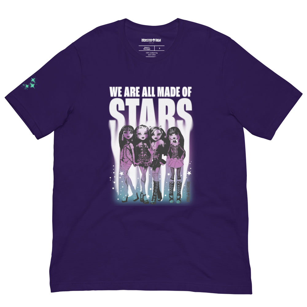This Monster High Made of Stars Purple T-Shirt is everything you've dreamed of and more. It feels soft and lightweight, with the right amount of stretch. It's comfortable and flattering for all. This exclusive Monster High design is only available through Mattel Creations.