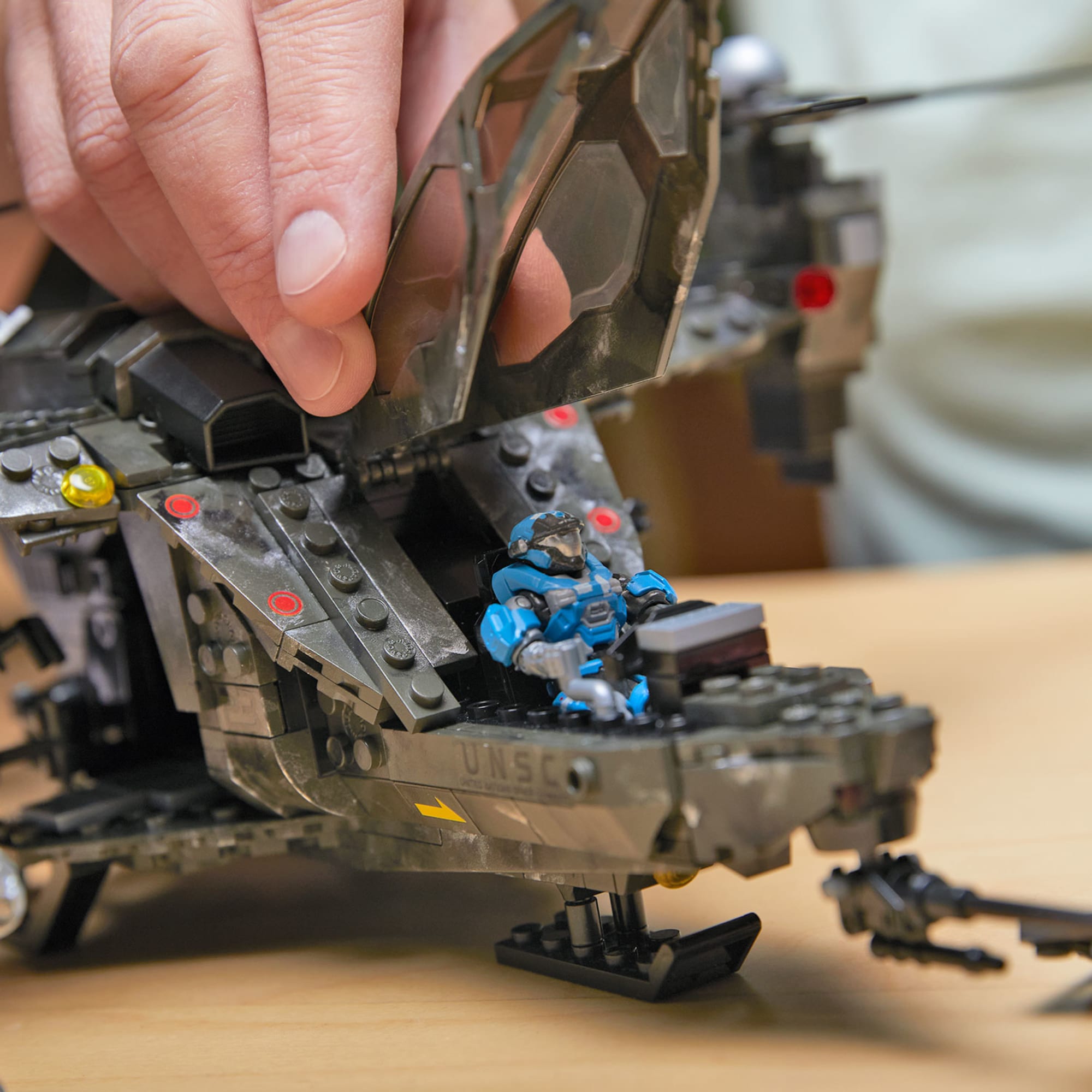 • UNSC Falcon helicopter building set with pilot cockpit and working door, dual spinning propellers, landing skids, posable gunner turret, and large side hatch