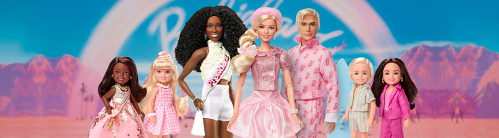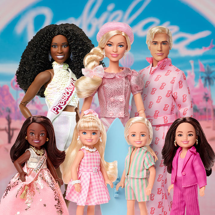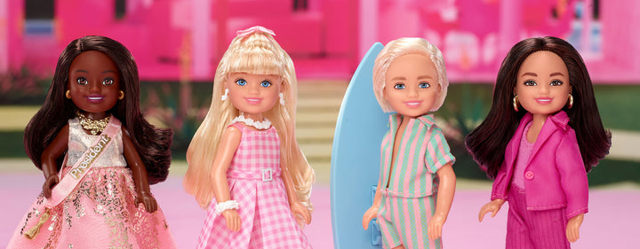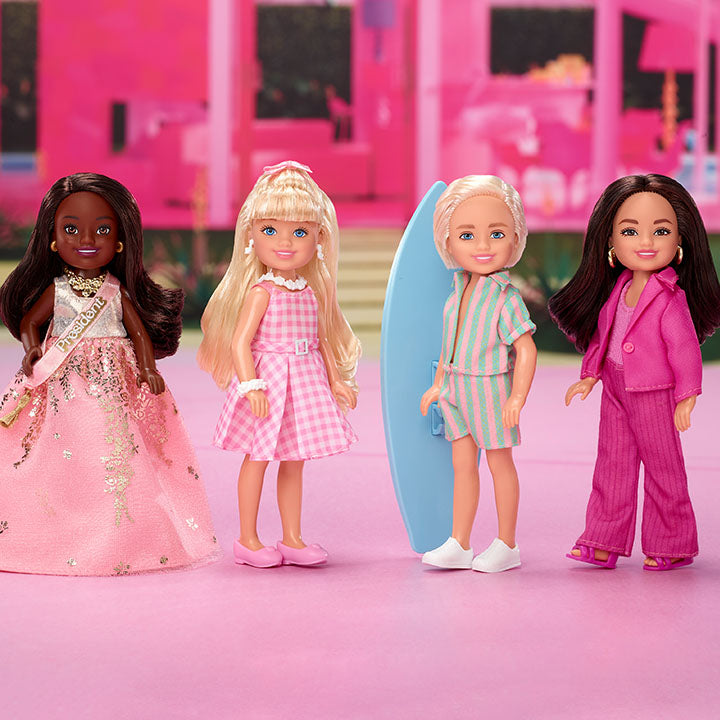 We’re celebrating the second anniversary of Barbie™ The Movie in an adorable way! These Chelsea-sized dolls have been made to look like characters you know and love from the blockbuster film. Our 4-pack features Barbie, Ken, President Barbie, and Gloria, each featuring rooted hair, and all wearing movie-inspired outfits, with accessories including shoes, earrings, and even Ken’s surfboard.