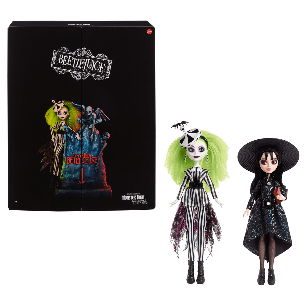 The makers of Monster High introduce Beetlejuice and Lydia Deetz  Skullector dolls, inspired by award-winning 1988 horror-comedy film Beetlejuice. Bring the haunting display to life with details inspired by the strange and unusual duo, including Beetlejuice doll’s frightfully fun carousel hat and a miniature replica of the Handbook for the Recently Deceased.  With premium packaging that sets the scene at the tombstone of everyone’s favorite bio-exorcist, this collectible Beetlejuice Skullector doll two-pack makes the perfect gift for fans and collectors.