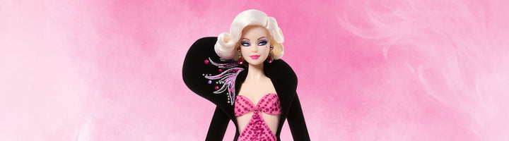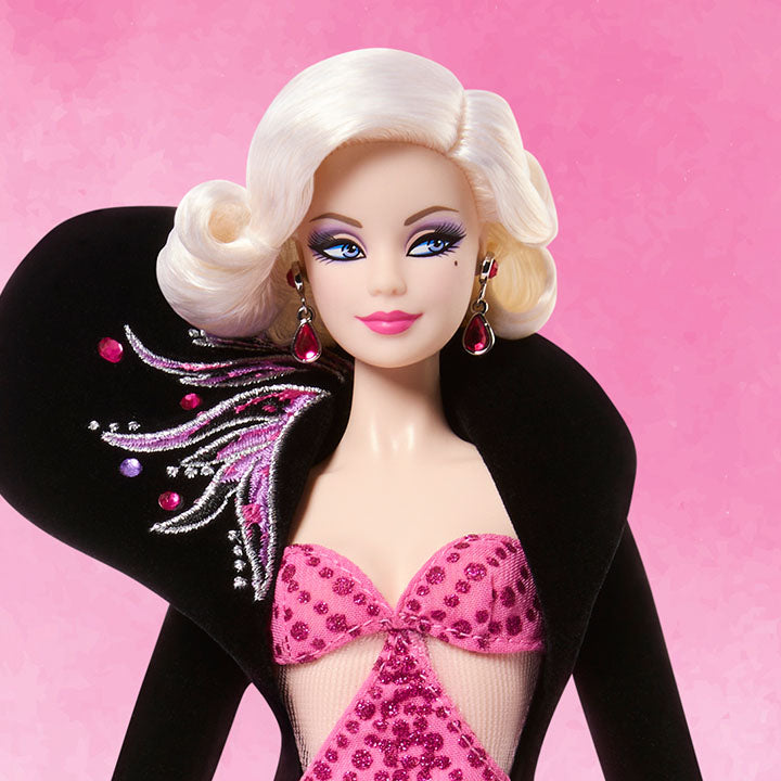 Renowned fashion designer Bob Mackie has returned to create another wildly fabulous Barbie doll. She’s the epitome of “pretty in pink,” channeling both the modern muse and the starlet of a bygone era. Her glitter gown is a return to classic Mackie glitz, paired with an elegant, dramatic coat embroidered with elegant flourishes on the hem and shoulder. With her chic platinum bob and extra-glam makeup, this Barbie doll is a fashionista with flair.