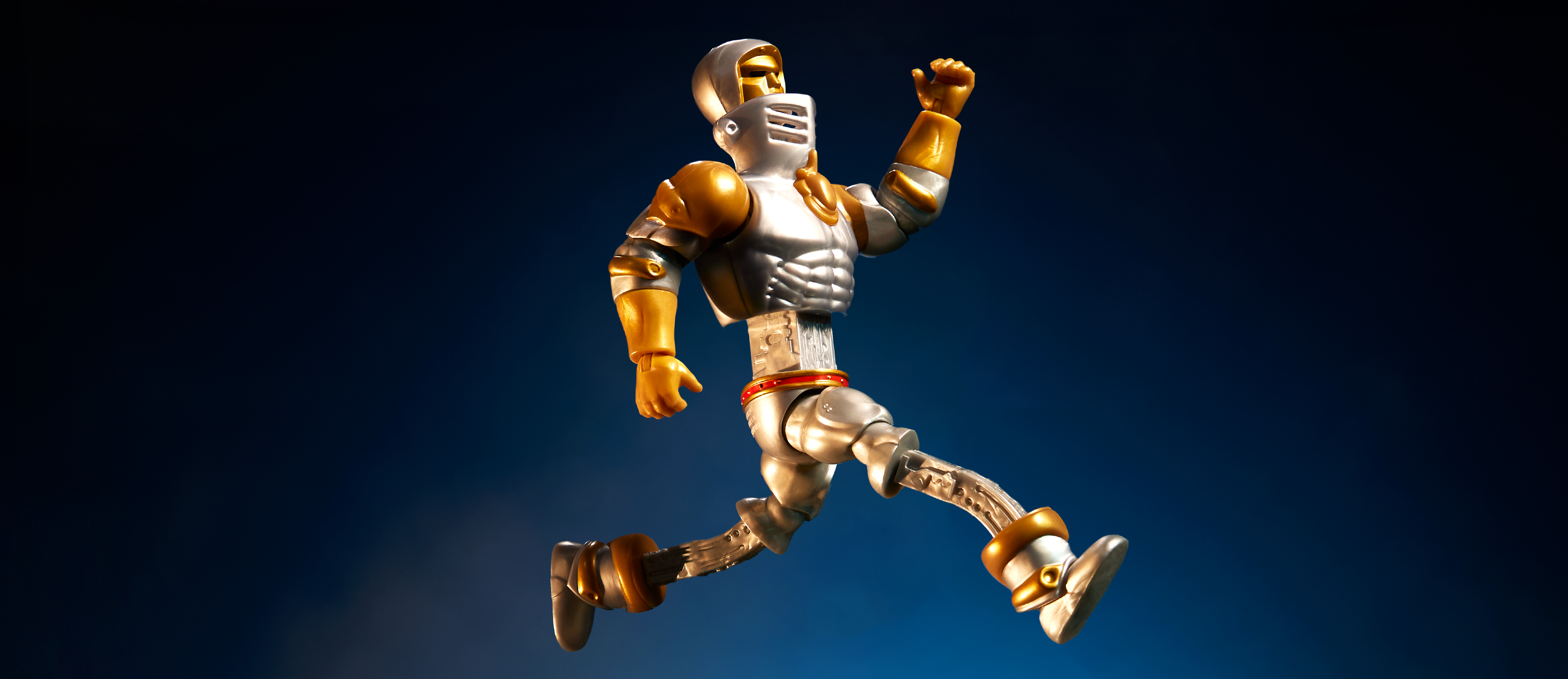 In addition to his extending body, our robotic knight has 16 points of articulation and wards off enemies with his folding shield.