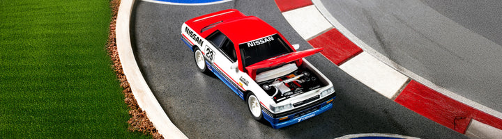 The R32 body is unmistakably boxy and beautifully simple. Custom racing livery with authentic Nissan branding evokes the look of their late 1980s touring car competitors.