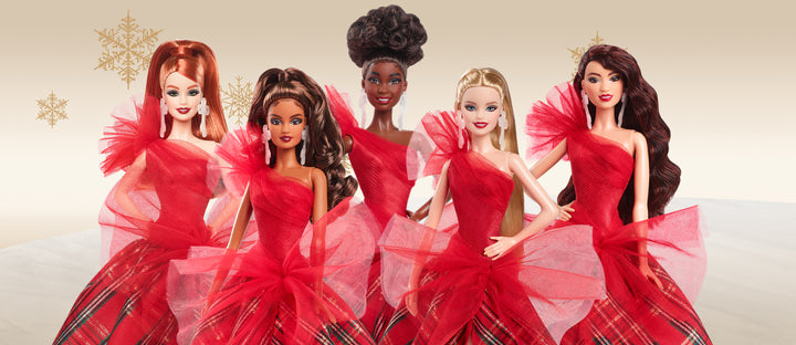 The 2024 Barbie Holiday Doll embodies the warmth and love of the season with a festive gown for a glamorous celebration. Showcasing gorgeous drama, the dress pairs a draping, one-shoulder, sparkling red bodice with a full, plaid ballgown-style skirt. Big tulle accents offer a modern take on a classic look, while statement earrings add to the elegance. In packaging that's ideal for display, this collectible doll makes a great gift for anyone looking to build a collection or brighten up their seasonal decorations.