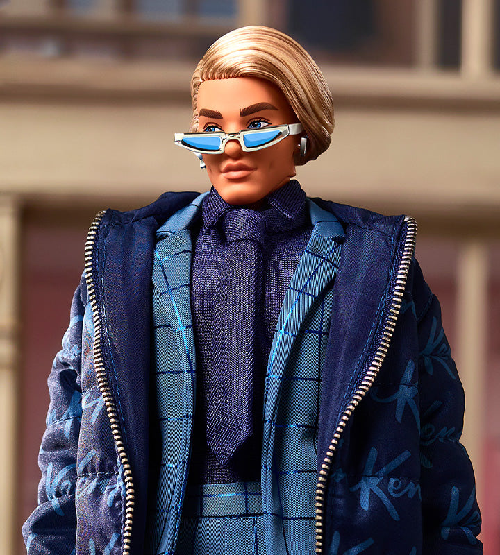 Wearing a bespoke blue metallic two-piece suit, this Ken doll kicks off the collection with some series Kenergy. The puffer jacket creates layered drama for the look.