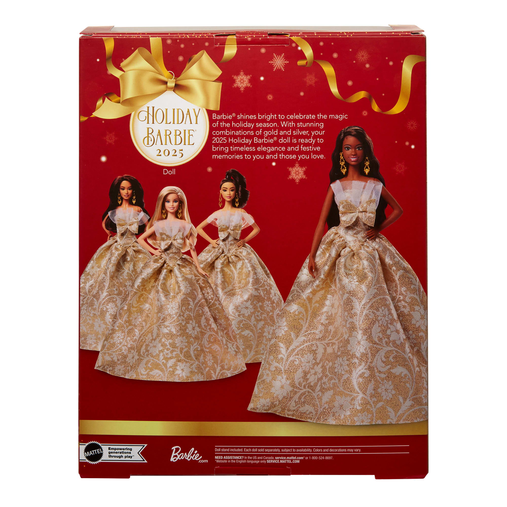The 2025 Barbie Holiday Doll is ready to embrace the delights of the season in style. She’s dressed for festive revelry in a voluminous gown with a silver and golden brocade pattern – an homage to holiday décor. The dress is packed with glamorous details, including a dramatic tulle-accented neckline and an oversized bow, complemented by cascading golden earrings and matching mules. In packaging that’s ideal for display, this doll is a perfect addition to collections or holiday wish lists.