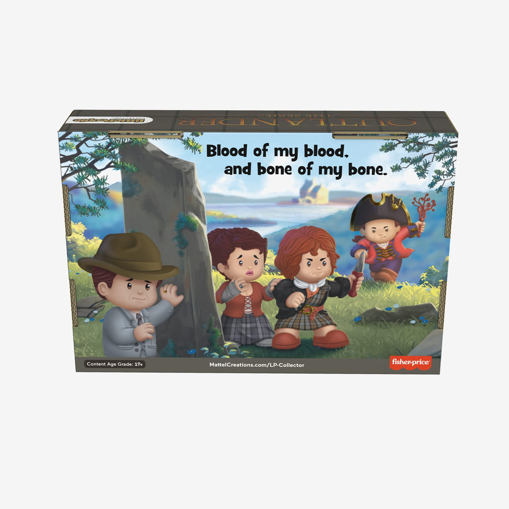 Scots, Sassenachs, and fans alike will fall in love with this special edition Little People Collector set commemorating the hit series, Outlander. This highly detailed figure set includes time-traveling nurse Claire Beauchamp Randall Fraser, Claire’s 20th-century husband Frank Randall, her 18th-century husband Jamie Fraser, and British Army Captain Jonathan “Black Jack” Randall, all brought down to Little People figurine size. Arriving in a specially designed package featuring the Scottish Highlands and the mystical stones of Craigh na Dun, this figure set is a must-have for Outlander fans and collectors.