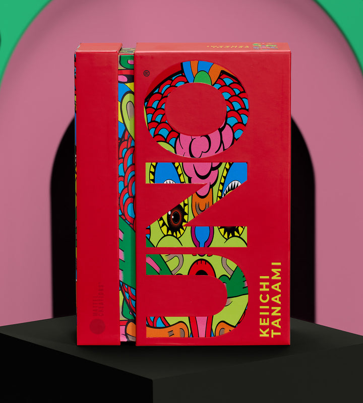 Our UNO deck features 112 cards, with uniquely different maximalist designs by Tanaami on each colorway, Wild, and Draw Four cards. This surreal deck brings the Japanese Pop Art legend’s playable art to the masses and makes every game a kaleidoscope of color.