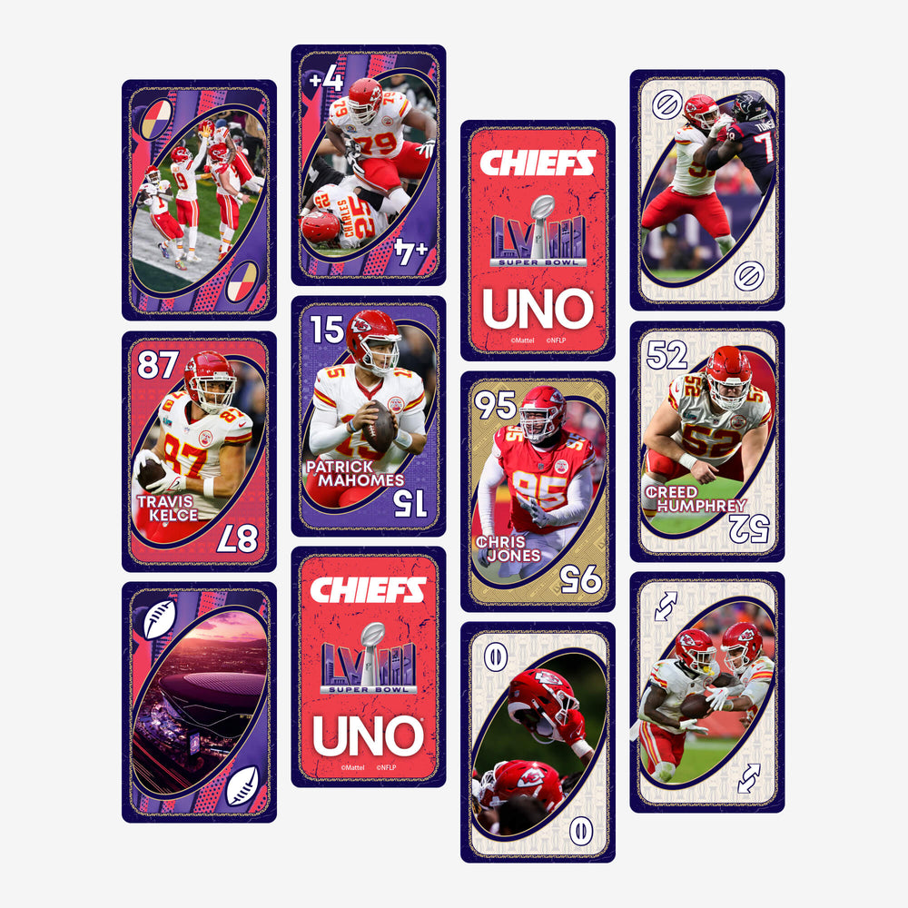 - The UNO game players love features images of players from the Kansas City Chiefs.