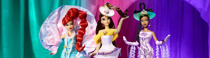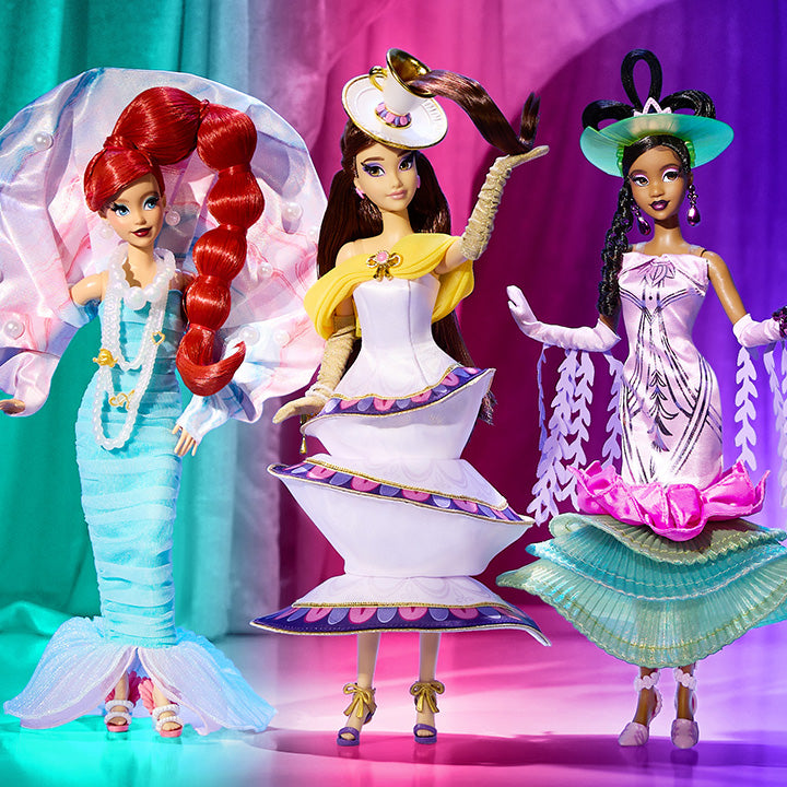 Iconic Disney movie scenes and characters get fantastical twists in the Once Upon a Whimsy Collection. Inspired by the “Ma Belle Evangeline” song in Disney’s The Princess and the Frog, Tiana doll’s extravagant fashion gives a playful nod to the lush bayou setting where Tiana first dances with Naveen. Her fitted charmeuse gown begins with an art deco print, then bursts into pleated lily pad layers, topped with a pink-petaled flower. Tiana is ready to dance her way into your heart and collection.