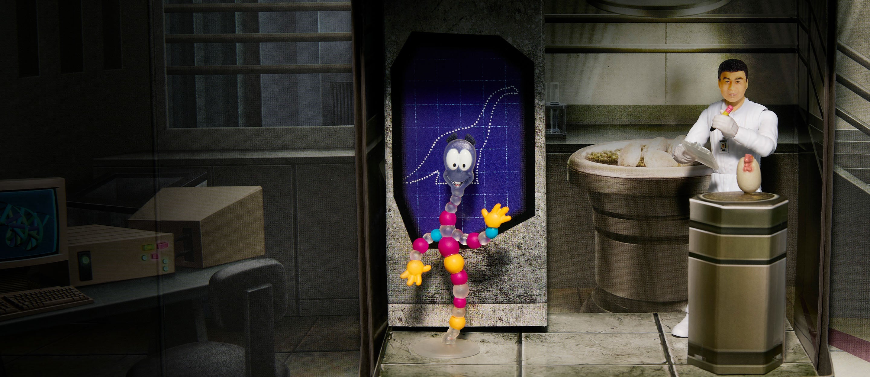 Dr. Wu's science-centric accessories include an InGen, pencil, and clipboard.  Your favorite anthropomorphic helix Mr. DNA speaks with 4 button-activated phrases triggered by a button on the packaging.