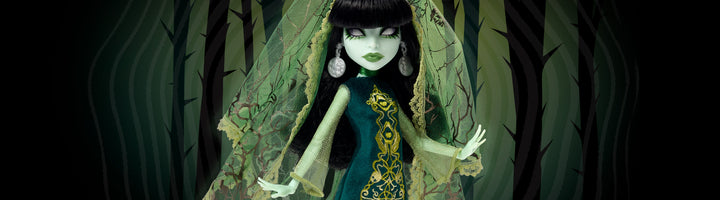 One of the sweetest ghouls at Monster High finally gets her own members-only Skullector doll, sure to make you shriek. Scarah Screams is a beautiful banshee with a faboolous ‘60s-era style. She’s all dressed up in a gore-geous green look inspired by her Emerald Isle scare-itage, including a velvet touch mini dress embroidered with psyche-Celtic details. She wears a supernatural shroud depicting the forest screamery of her homeland, sheer green tights, and dainty mid-century flats that double as haunting heels.