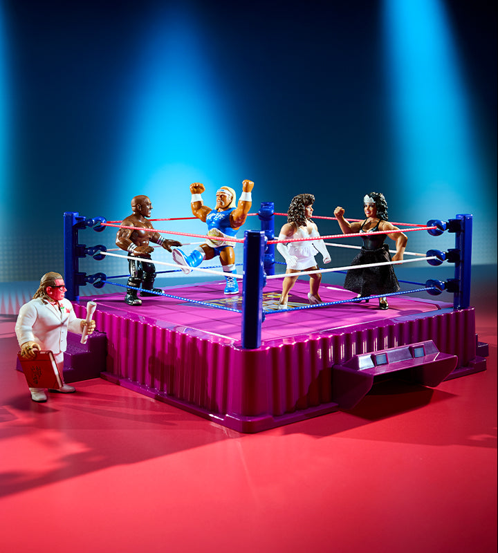 Stage a Royal Rumble with the Official WWE® Retro Ring and Brother Love™ action figure. This ring is a nostalgic nod to the classic ’90s WWE sets, complete with authentic Royal Rumble and WWE decals, spring ropes, removable stairs, and championship title and announcer tables. Brother Love enters the ring as a first-time Retro figure. Featuring his signature throwback move, iconic book and mic, he’s ready to deliver his message of brotherly love.